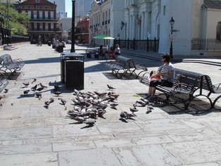 The pigeons in Jackson Square (or rats w/wings as they're so lovingly referred to) and the sparrows rely on a steady stream of tourists for all their food. So, from the beginning, Poppy and I have left the safety and security of our home once a day to go feed them. On the 15th of May, the day before Phase One, a character of the Quarter, an acquaintance of ours who is an always-buzzed, fairly average singer was doing his karaoke bit in the Square. Between jams he announced that he was taking advantage of his last chance to perform solo in the space. Soon people would return! He then went on to talk about the next wave of the virus which will surely come now that they're opening everything back up. He started the music for his next song announcing, "who do you think's responsible for all this?" The song was "Sympathy for the Devil" and I, along with a hustler of the Quarter who resembles Mohammed Ali, did the "whoo whoo's".